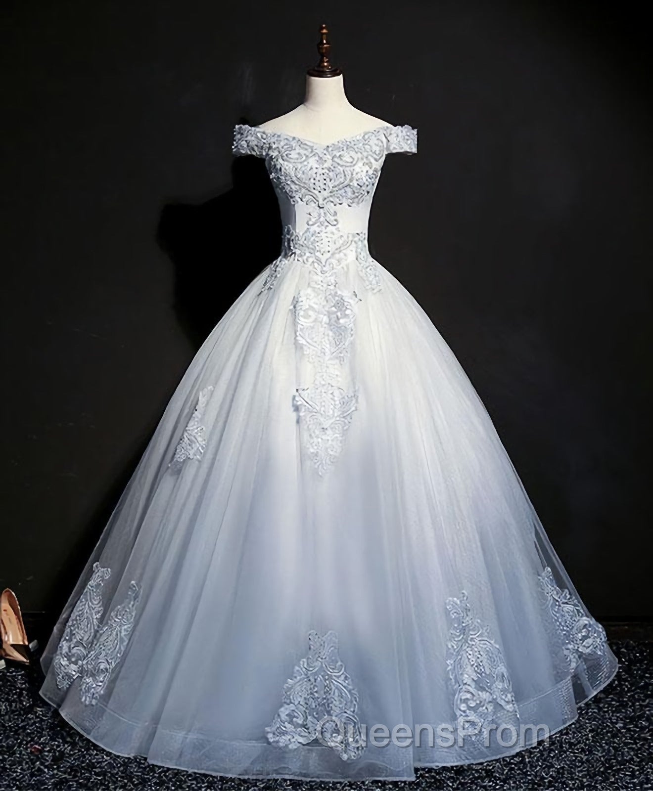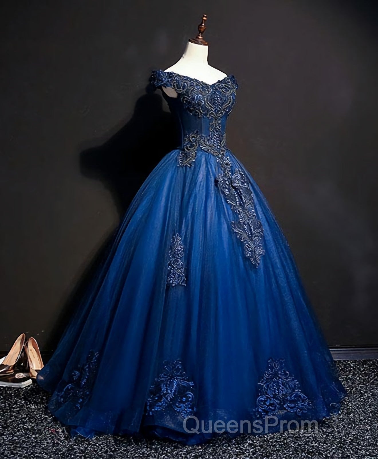 Blue Tulle Lace Off Shoulder Long Evening Prom Dress, Blue Tulle Lace Evening Dress