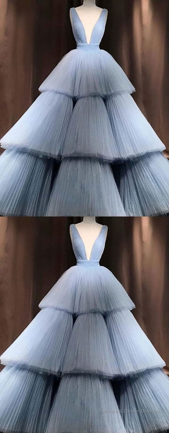 Blue V Neck Tulle Long Prom Dress, Blue Tulle Evening Dress