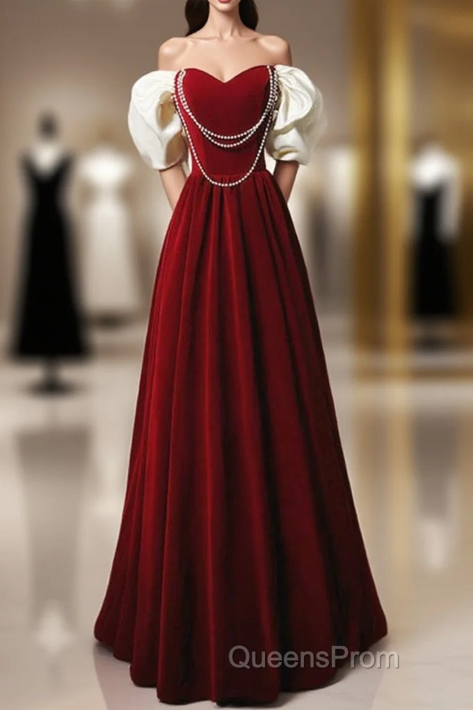 Burgundy A-Line Off Shoulder Velvet Lace Long Evening Prom Dress, Burgundy Long Formal Dress