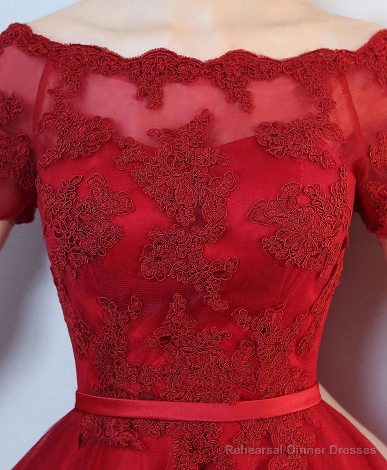 Burgundy Lace High Low Short Prom Dress, Lace Evening Dress