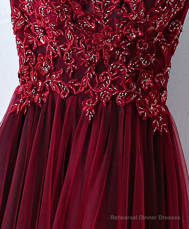 Burgundy One Shoulder Long Prom Dress, Lace Evening Dress