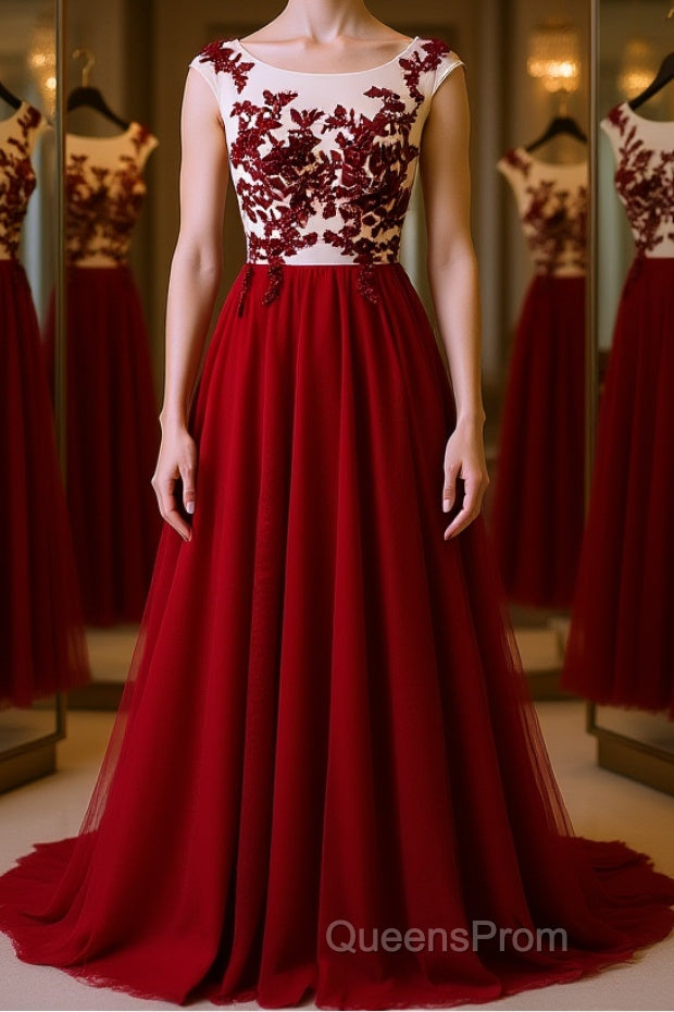 Burgundy round neck tulle lace long Evening Prom Dress, bridesmaid Dress