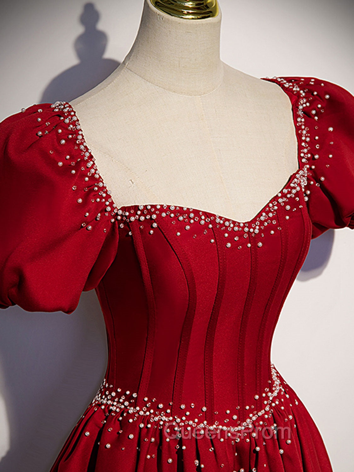 Burgundy Satin Beads Long Evening Prom Dress, Burgundy Long Evening Dress