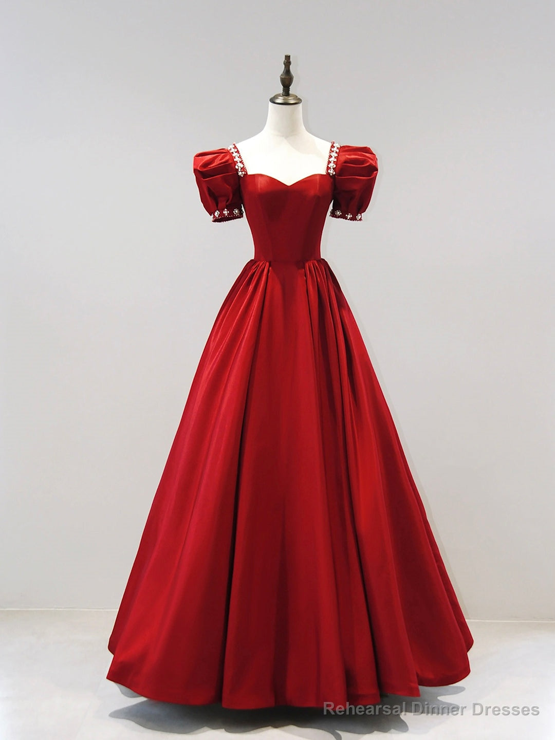 Burgundy Satin Floor Length Princess Dress with Beaded, A-Line Short Sleeve Evening Party Dress
