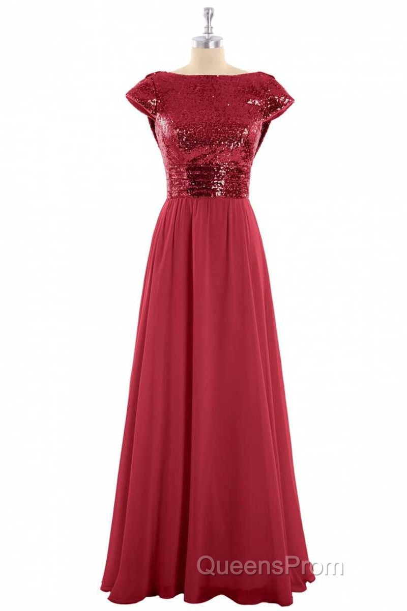 Burgundy Sequin Cap Sleeve Backless A-Line Bridesmaid Dress