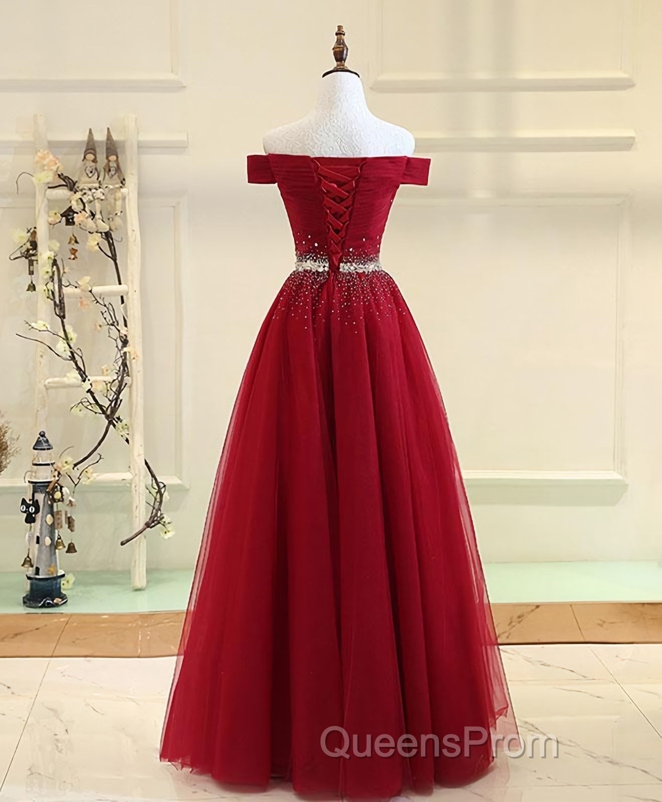 Burgundy Tulle Off Shoulder Long Evening Prom Dress, Burgundy Evening Dress