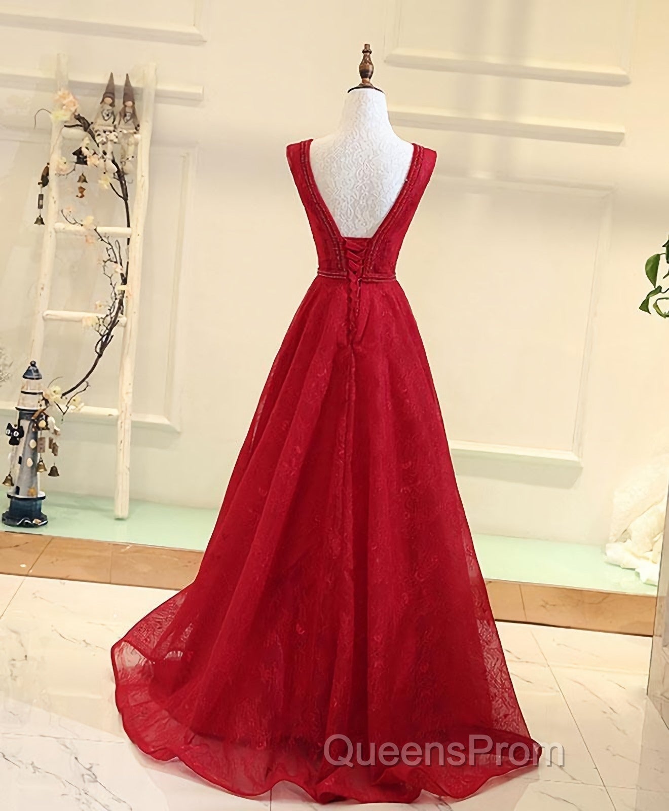 Burgundy V Neck Lace Long Evening Prom Gown Burgundy Evening Dress