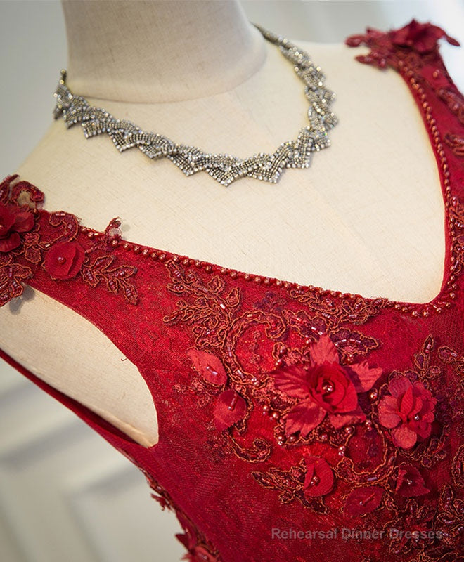 Burgundy V Neck Tulle Short Long Dress, Burgundy Evening Dress