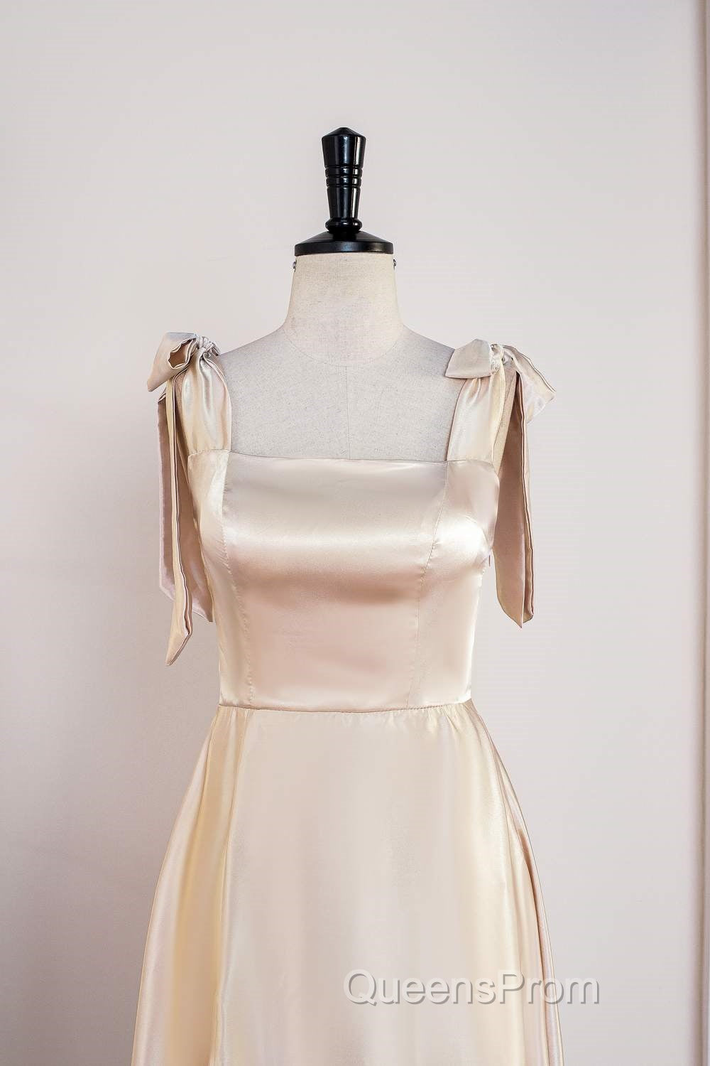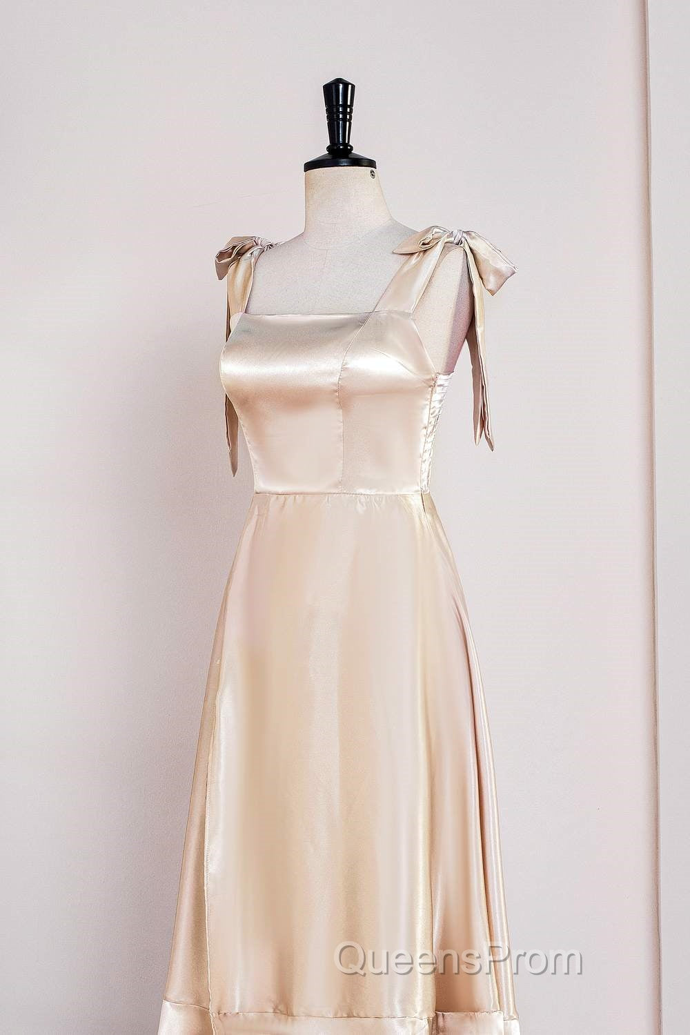 Champagne Bow Tie Straps A-line Satin Tea-Length Bridesmaid Dress