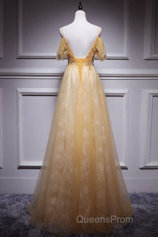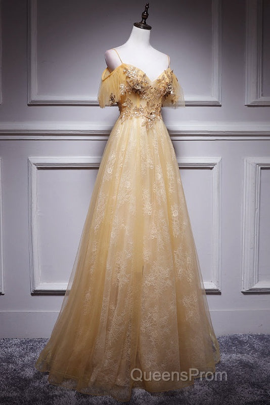 Champagne Lace Off Shoulder Long Party Dress , Cute Tulle Formal Dress Evening Prom Dress