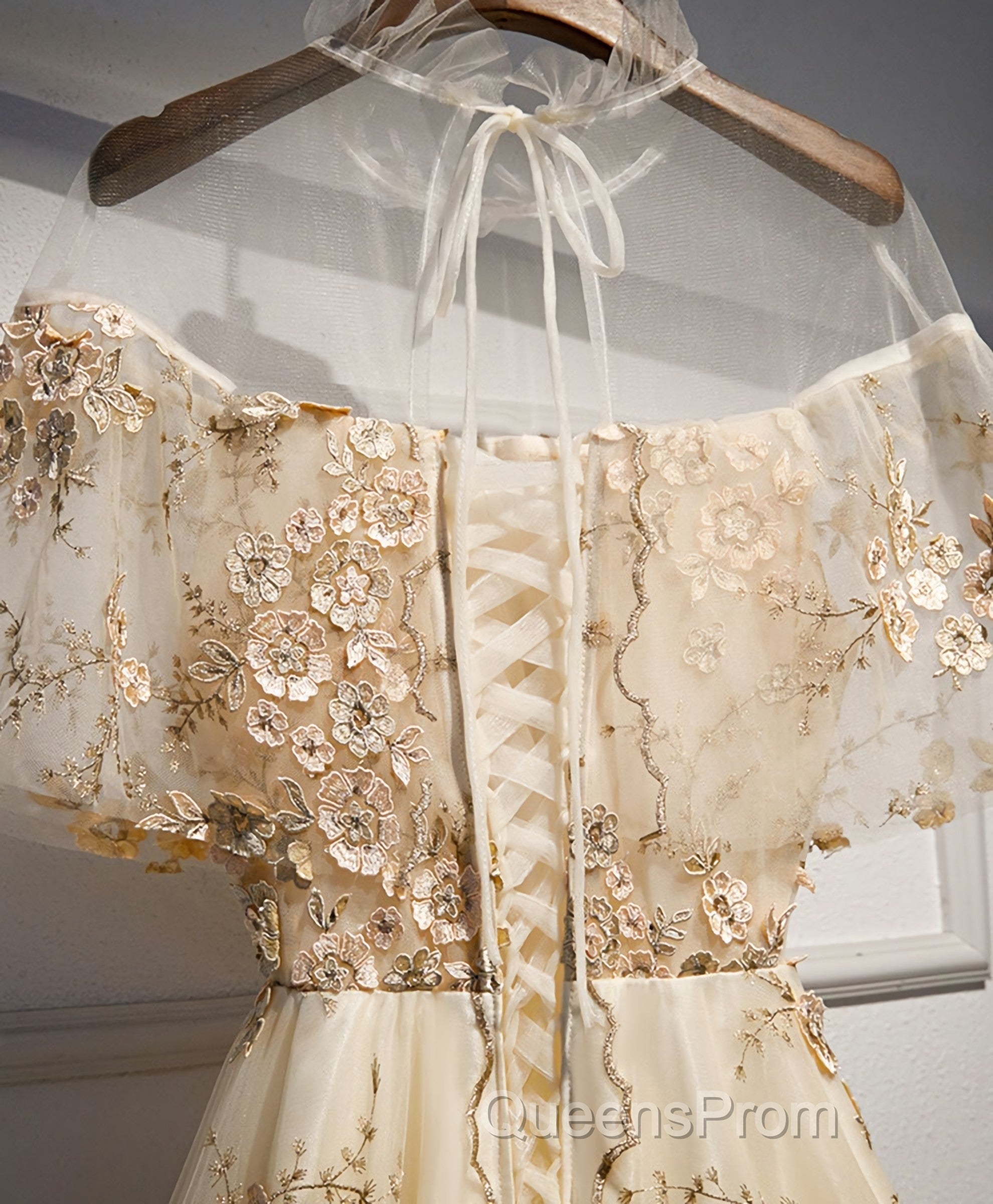 Champagne Tulle Lace Long Evening Prom Dress, Champagne Formal Dress, 1