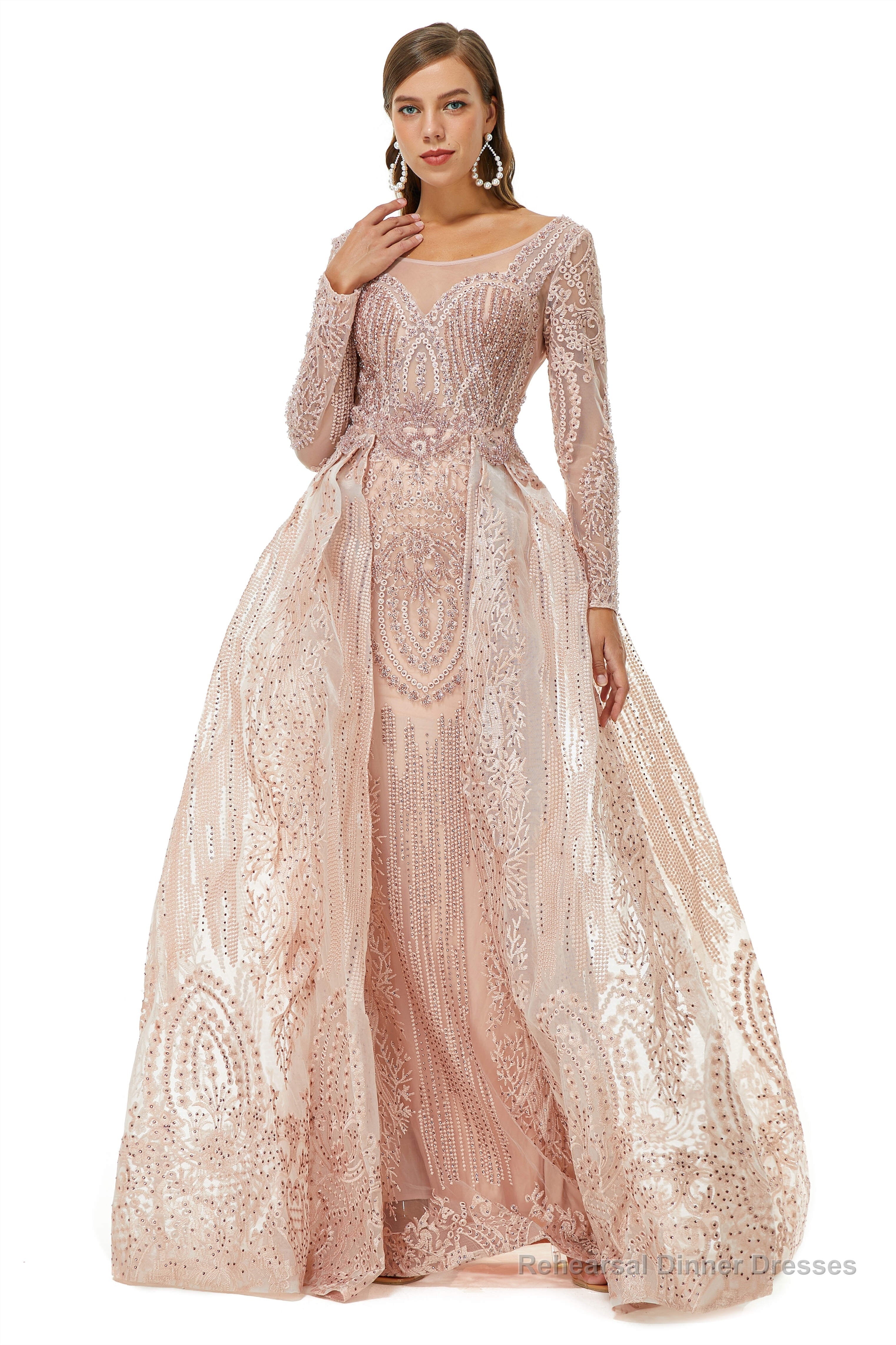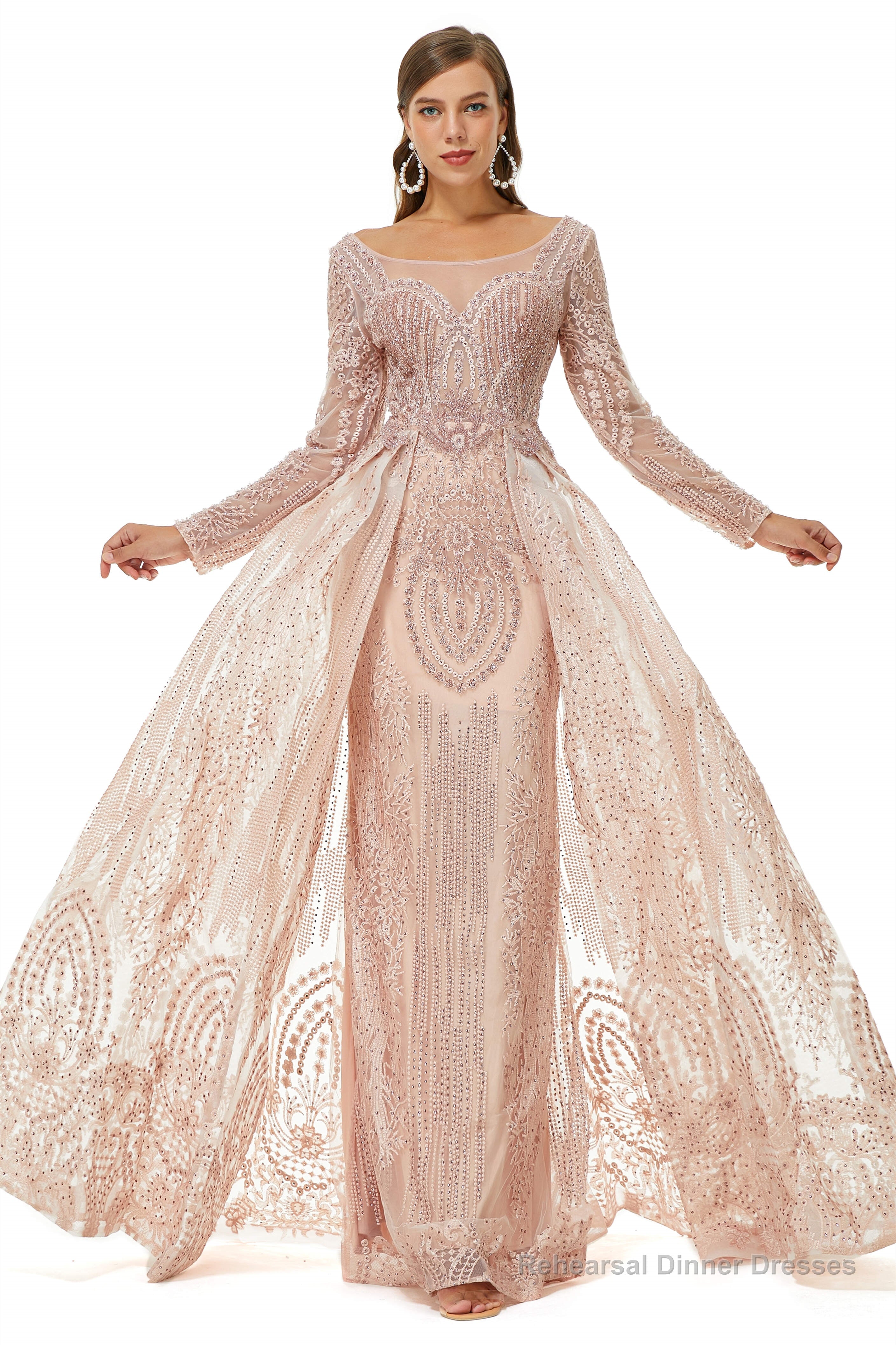 Champange Sparkle Beaded Long Sleeves Prom Dresses