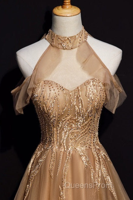 Charming Champagne Tulle Halter Long Party Gown, Evening Prom Dress