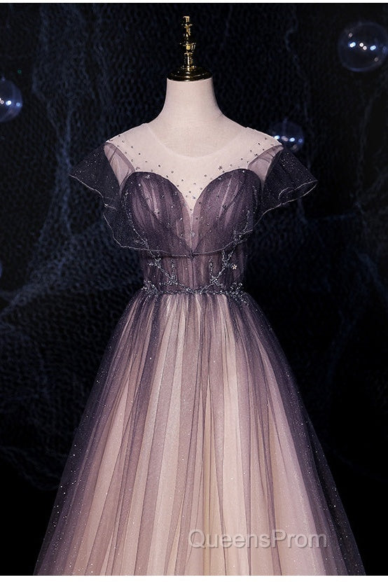 Charming Tulle Gradient Cap Sleeves Long Party Dress, A-Line Evening Gown