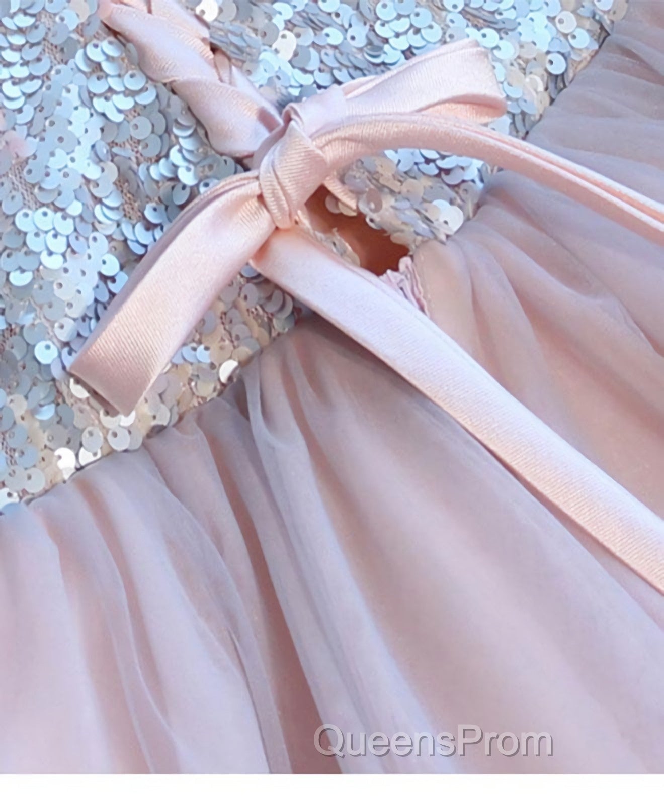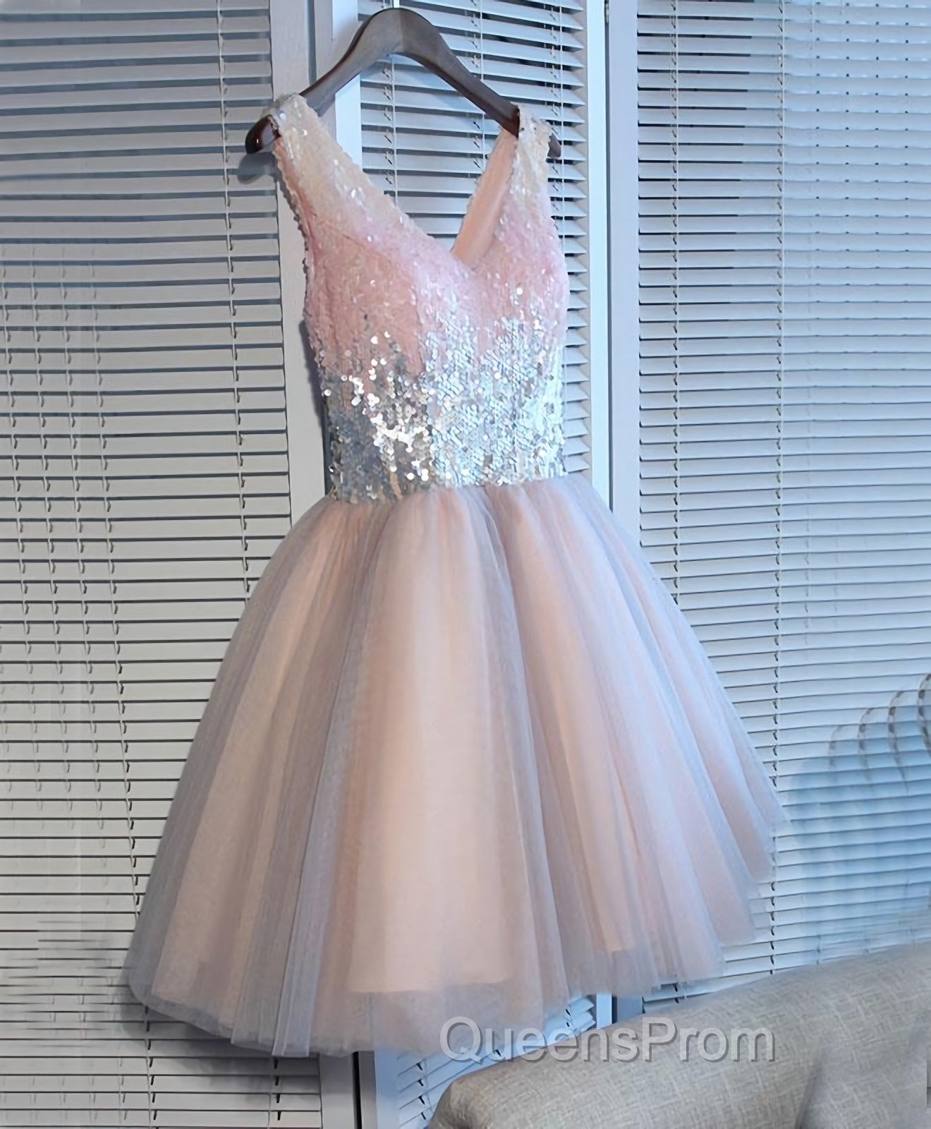 Cute Pink V Neck Tulle Seqsuins Short Evening Prom Dress, Cocktail Dress