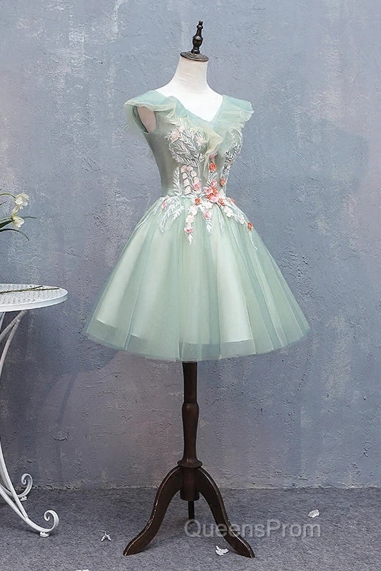 Cute Short Tulle V-Neckline With Flower Lace Party Dress Homecoming Dress, Short Formal Dress