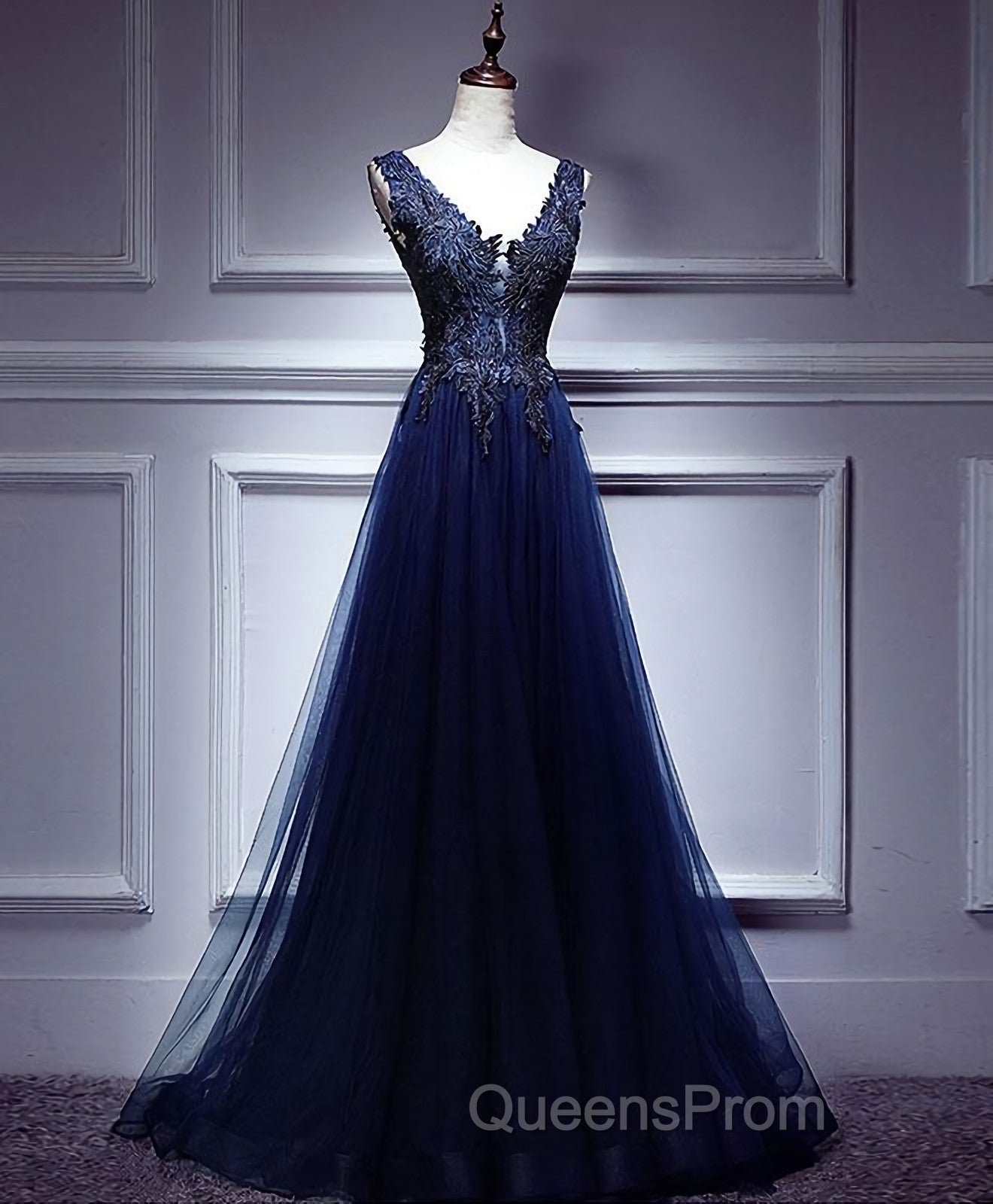 Dark Blue Lace V Neck Long Evening Prom Dress, Lace Evening Dress