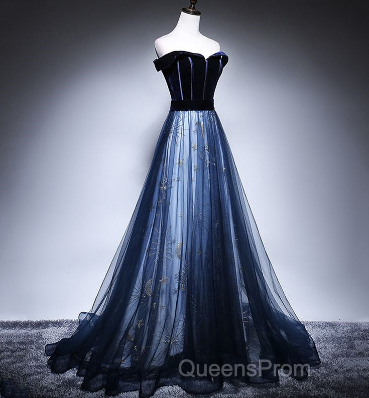 Dark Blue Tulle Velvet Long Evening Prom Dress, Blue Evening Dress