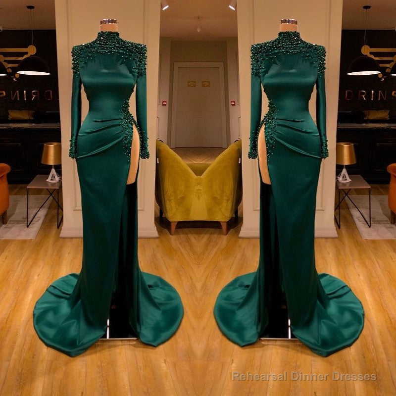 Dark Green Beadings Pearl Long Sleeves Evening Gowns Mermaid Prom Dress With Slit