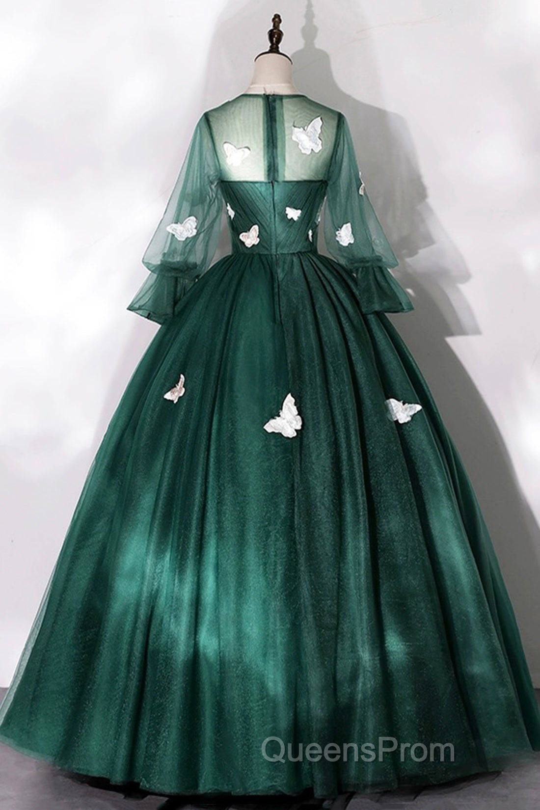 Dark Green Tulle Long Evening Prom Dress, A-Line Long Sleeve Evening Party Dress With Butterfly Appliques