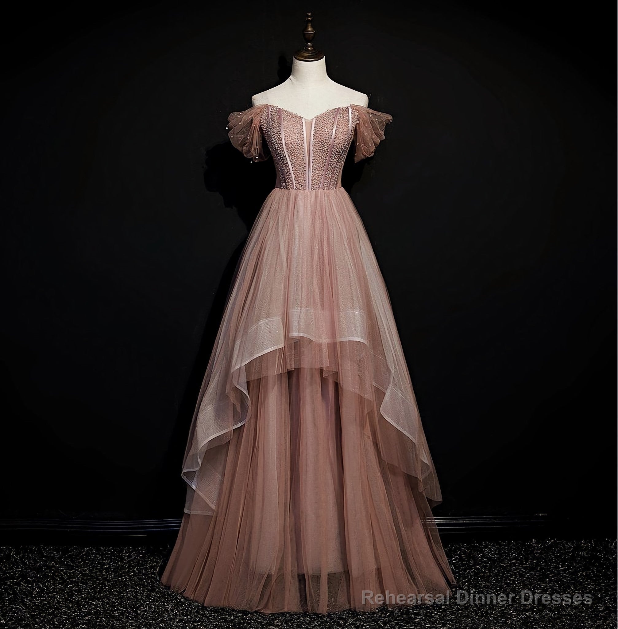 Dark Pink Tulle Beaded Layer Tulle Long Evening Dress, Charming Prom Dress