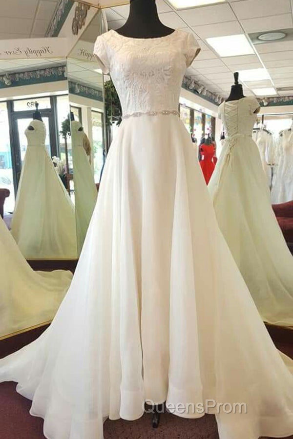 Delicate Round Neck Short Sleeves Sweep Train Lace Appliques Wedding Dress