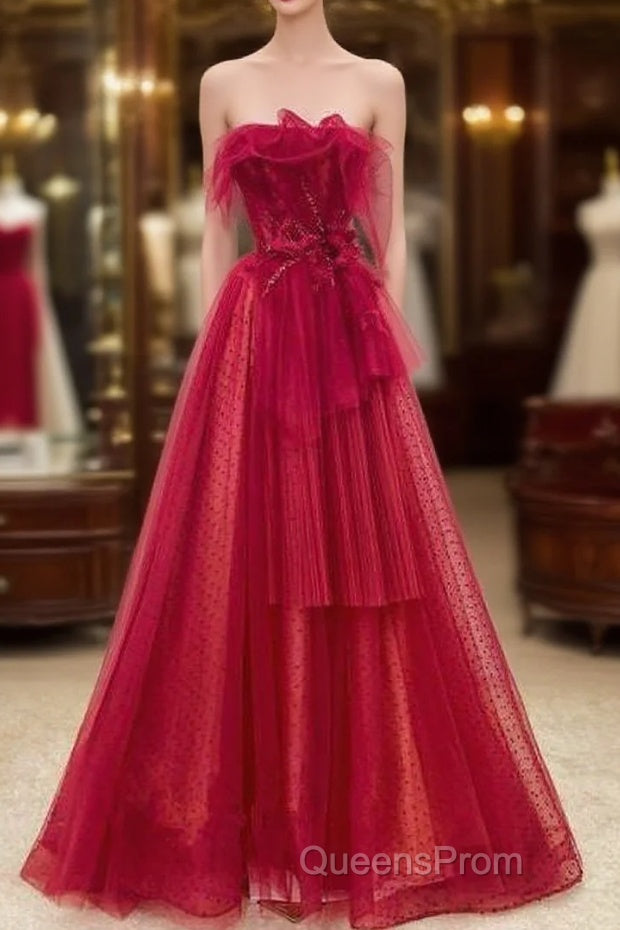 Elegant A Line Strapless Red Tulle Long Evening Prom Dress