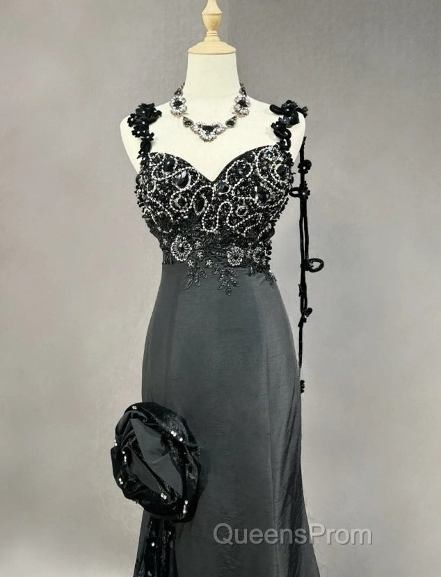 Elegant Black Mermaid Satin Beaded Sequin Long Evening Prom Dress, Sweetheart Neck Evening Dress