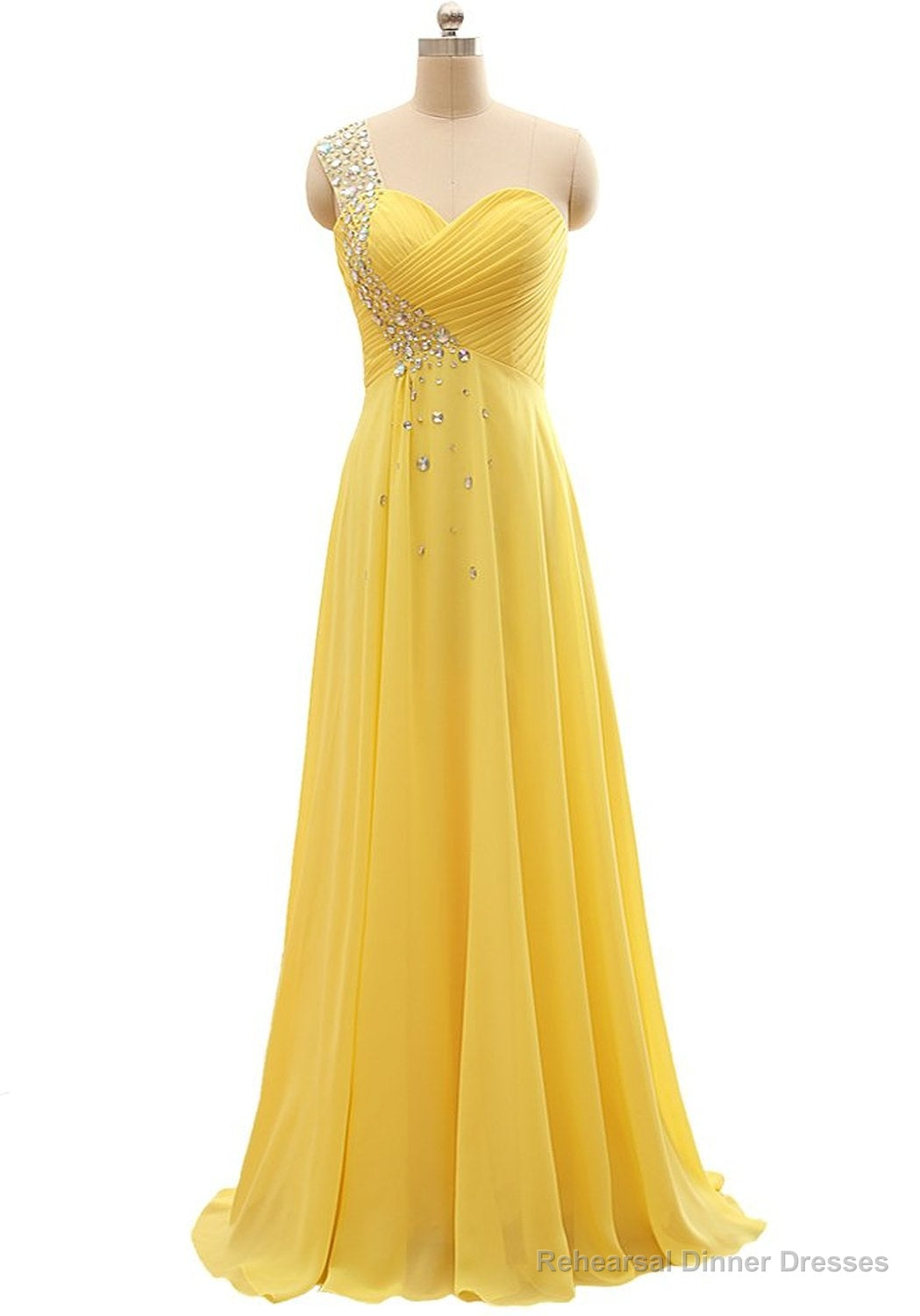Elegant One Shoulder Yellow Chiffon Beaded Pleat Long Bridesmaid Dresses