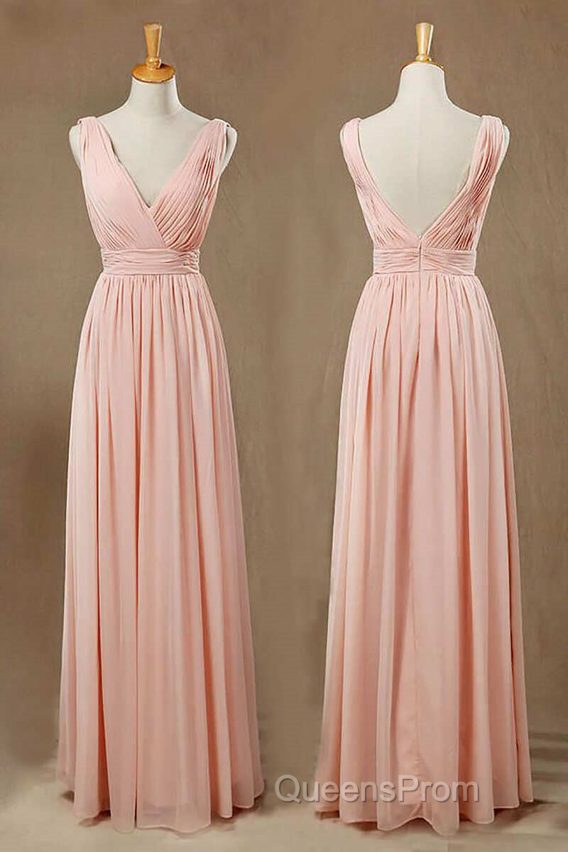 Elegant Plush Pink V-Neck Open Back A-Line Long Bridesmaid Dress