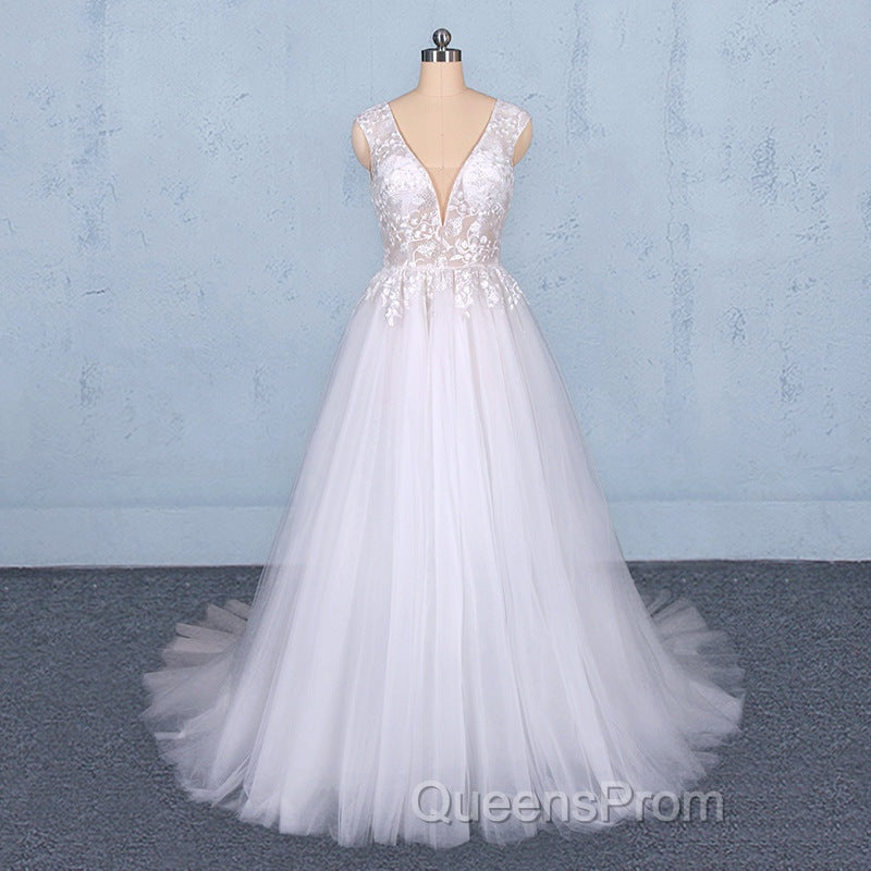 Flowy A-line Long V-neck Lace Tulle Beach Wedding Dress Bridal Gowns