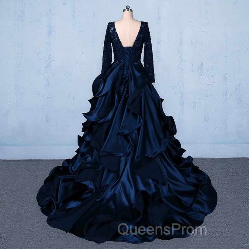 Formal V-neck Beading Lace Satin Backless Ball Gown Evening Prom Dress With Sleeves