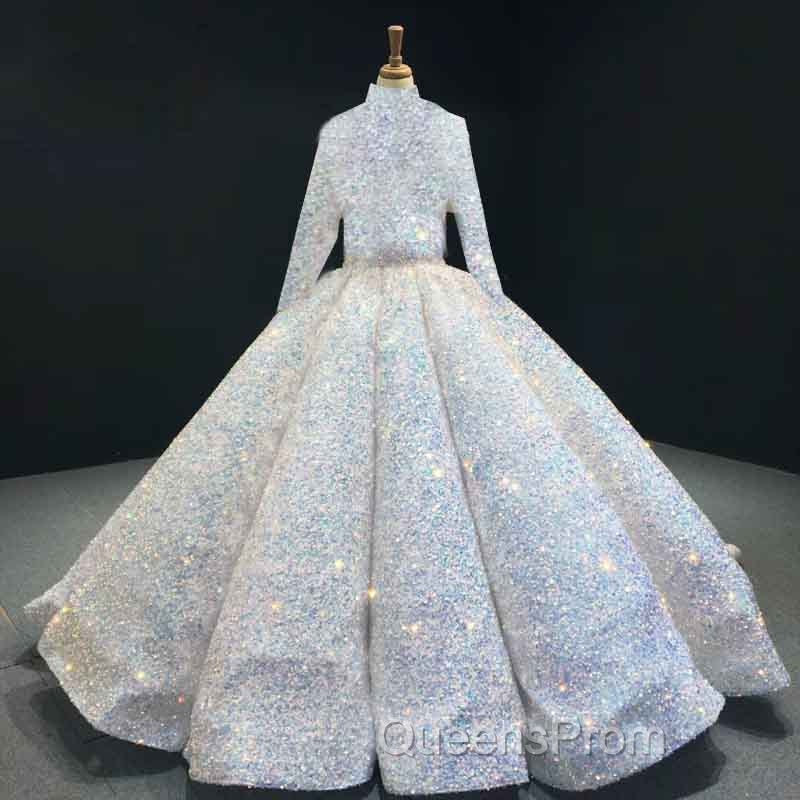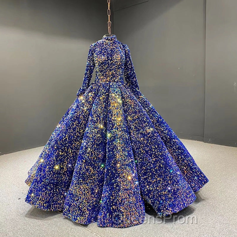 Glitter High Neck Open Back Lace Up Ball Gown Evening Prom Dress