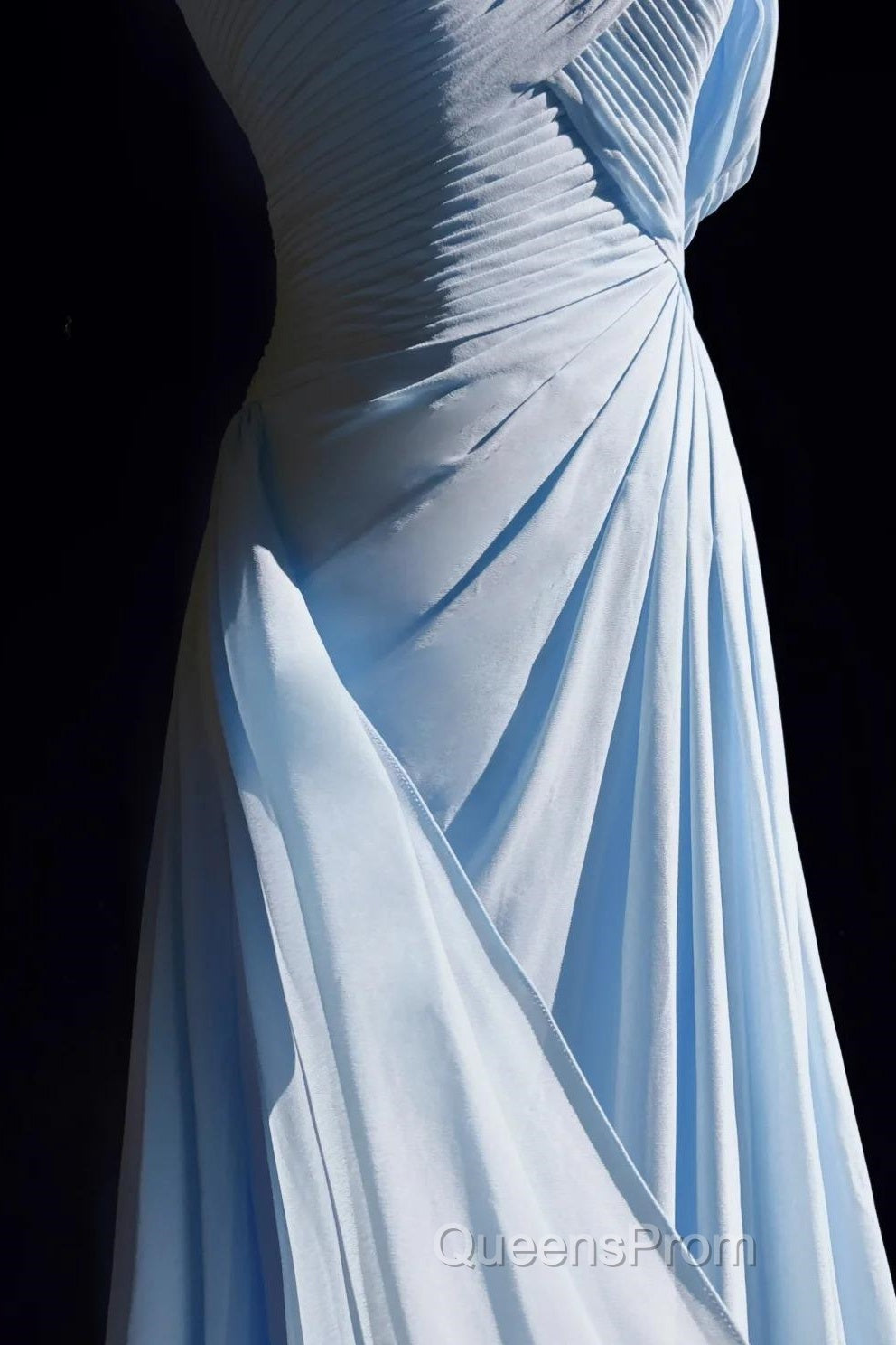 Gorgeous Blue A-Line Chiffon Pleated One Shoulder Slit Long Evening Gown Ball Gown Wedding Dress