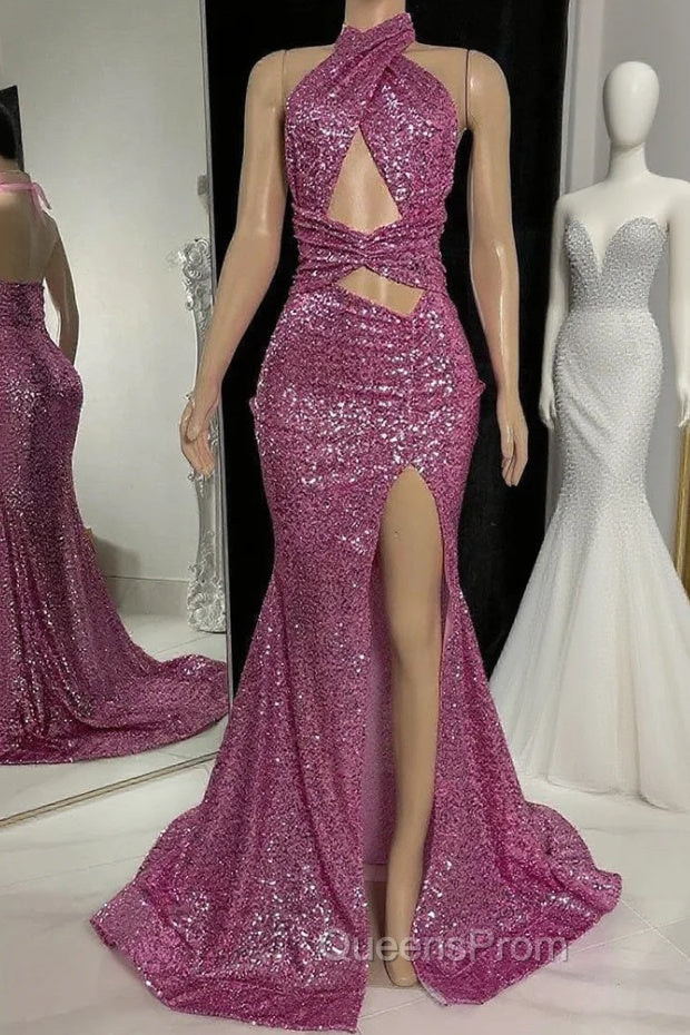Gorgeous Halter Pink Evening Prom Dress Sequins Sleeveless Long With Split