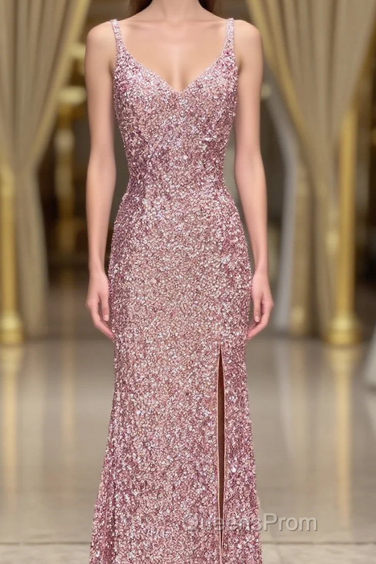 Gorgeous Mermaid V-Neck Pearl Pink Long Evening Prom Dress with Slit