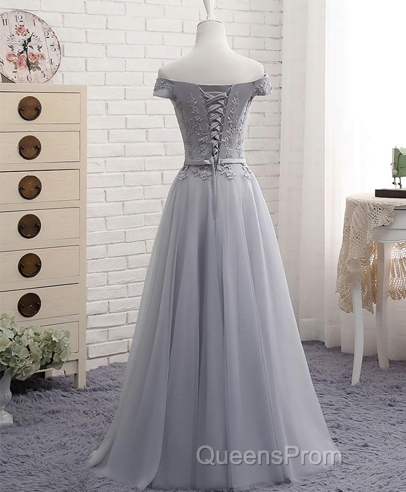 Gray A Line Lace Off Shoulder Evening Prom Dress, Lace Evening Dress