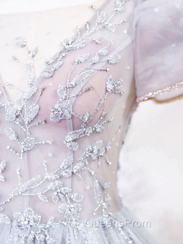 Gray Round Neck Tulle Lace Long Evening Prom Dress, Gray Tulle Evening Dress