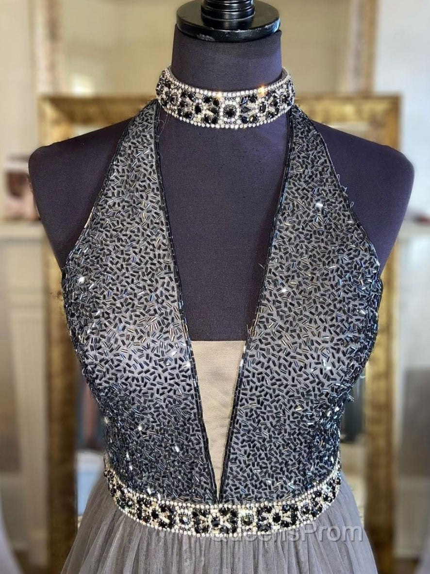 Gray v neck tulle beads long Evening Prom Dress, gray tulle formal Dress