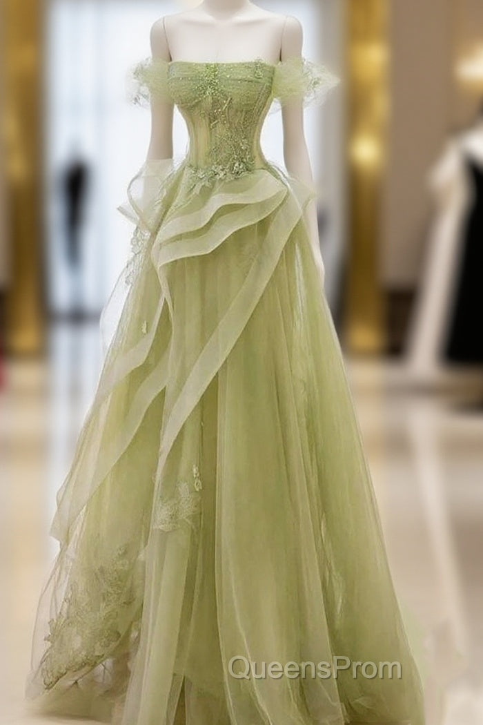 Green Off Shoulder Lace Long Evening Prom Dress, Green Formal Dress