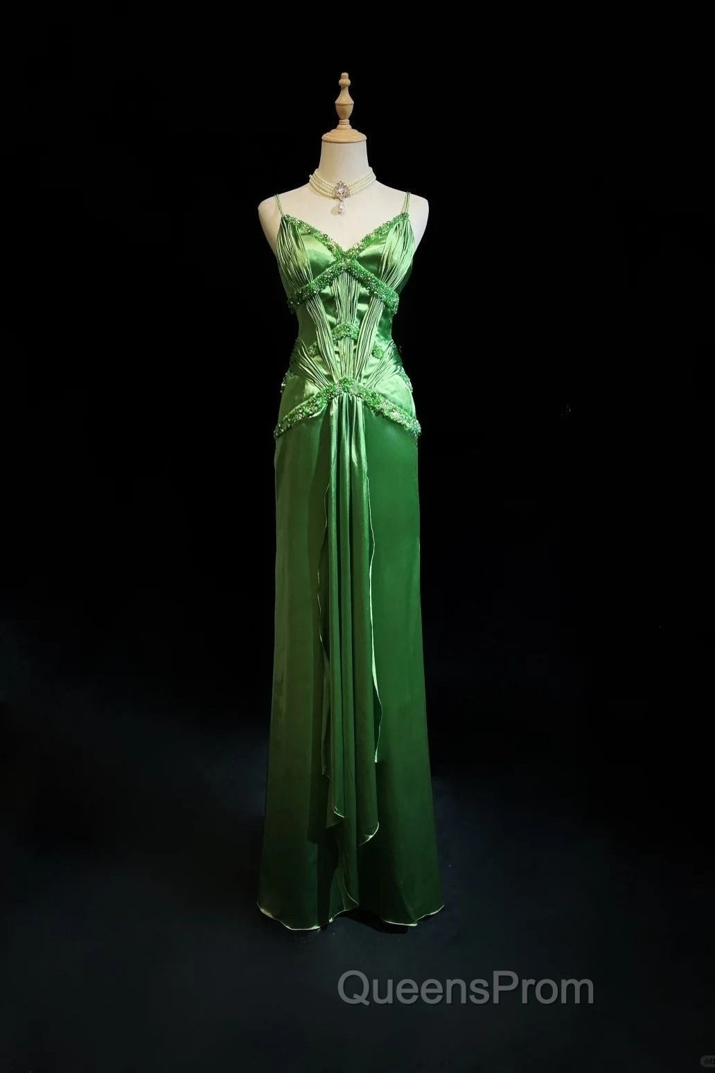 Green Spaghetti Strap Sheath Satin Beaded Evening Prom Dress Evening Gown