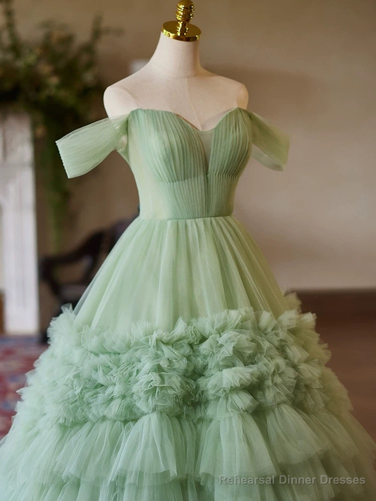 Green Sweetheart Tulle Off Shoulder Layers Long Formal Dress, Green Sweet 16 Dress