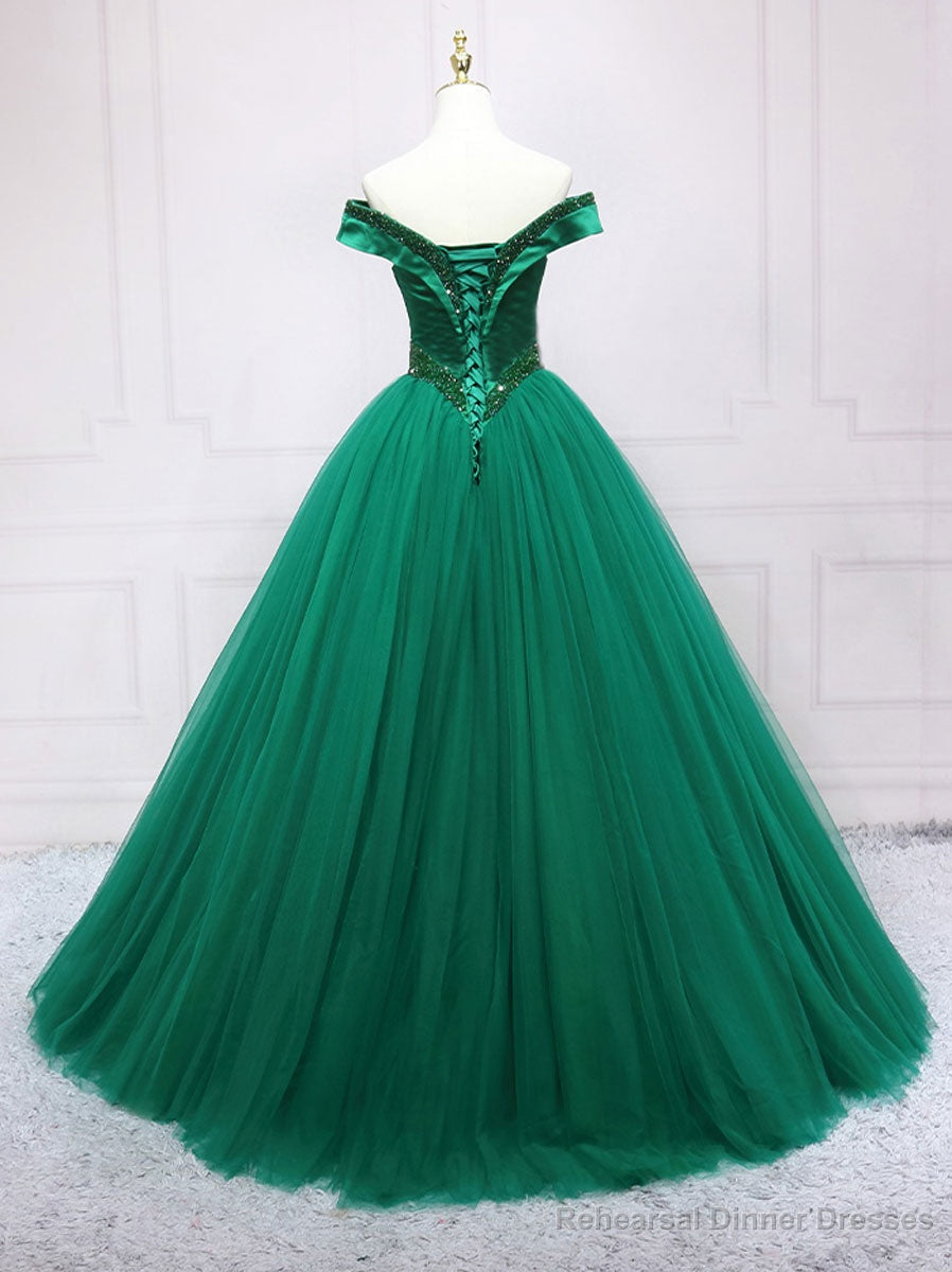 Green Tulle Off Shoulder Tulle Beads Long Prom Dress, Green Formal Graduation Dresses