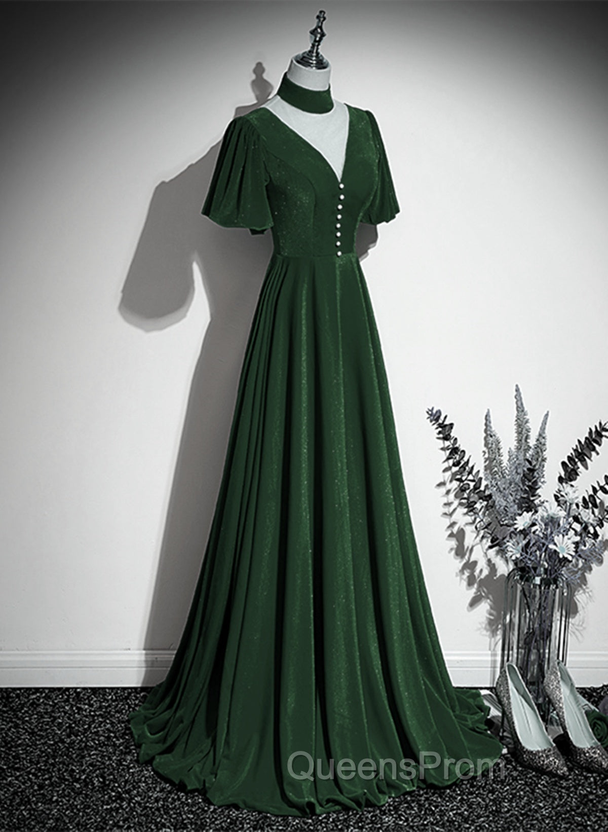 Green Velvet A-Line Short Sleeves Long Party Dress, Green Long Evening Prom Dress