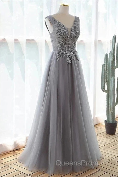 Grey A-Line Tulle With Lace Long Formal Dress V-Neckline Evening Prom Dress Sleeveless December Wedding Guest Dress