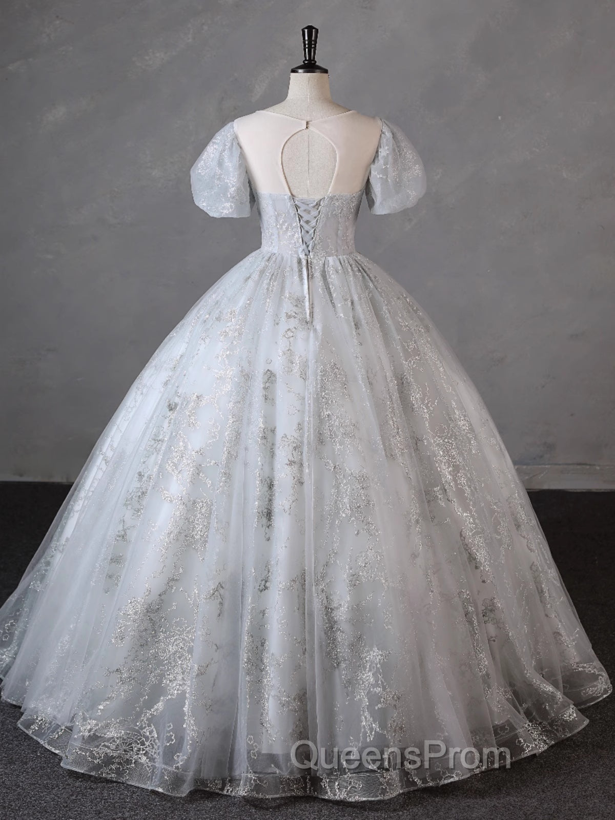 Grey Short Sleeves Tulle Ball Gown Evening Prom Dress, Grey Ball Gown Sweet 16 Dress