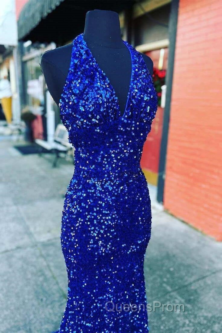 Halter Royal Blue Sequin Evening Dress Uk Long Evening Prom Dress