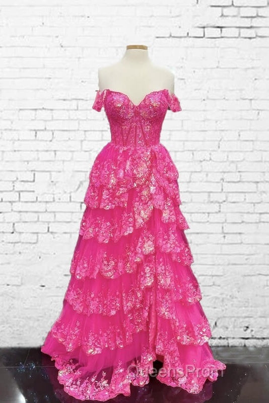 Hot Pink Lace Off Shoulder Tiered Evening Prom Dress With Slit