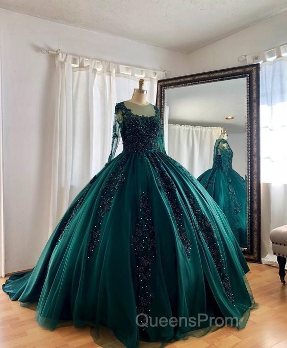 Lace Beaded Green Ball Gown Quinceanera Dress Long Sleeves Graduation Dress