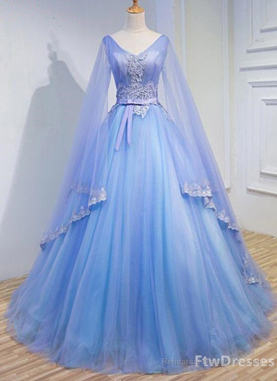 light blue tulle v neck long sleeve lace applique prom dress for teen